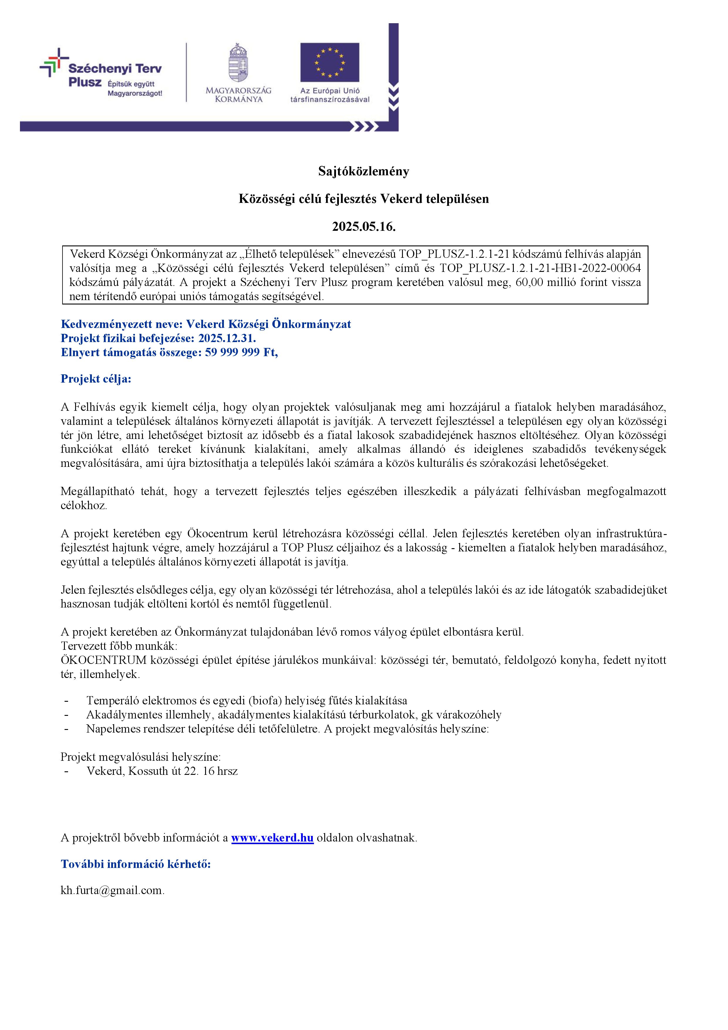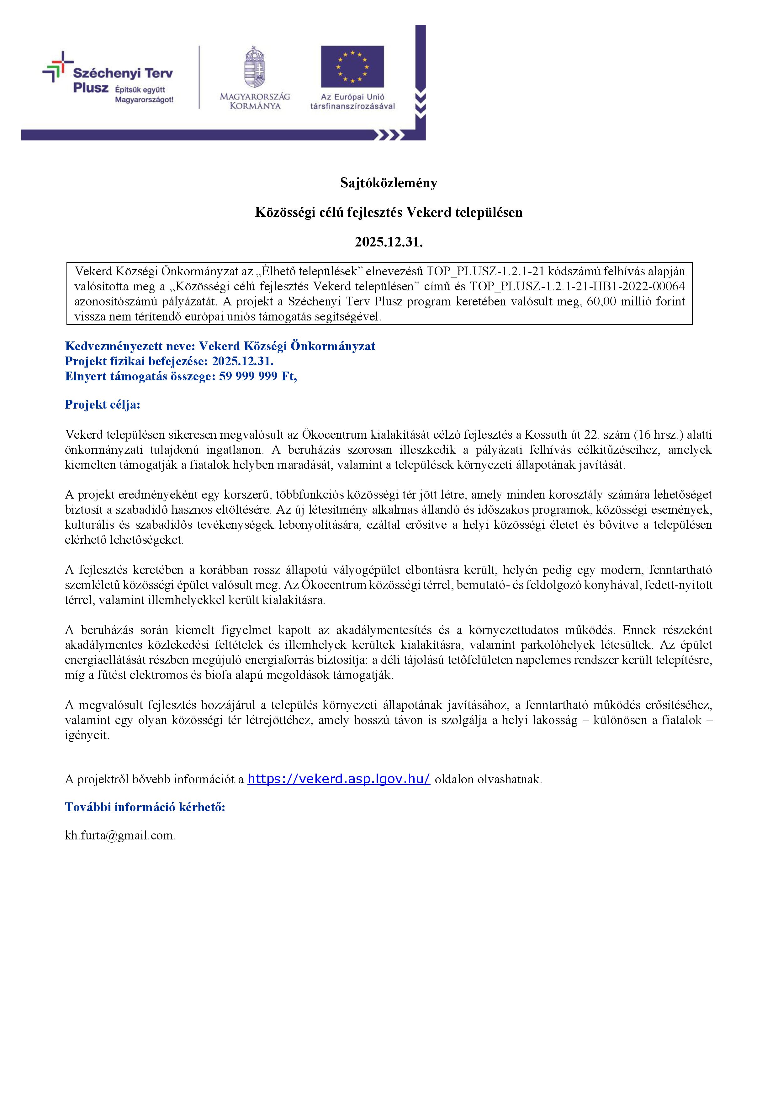 Vekerd Községi Önkormányzat az „Élhető települések” című TOP_PLUSZ-1.2.1-21 kódszámú felhívás alapján valósítja meg a „Közösségi célú fejlesztés Vekerd településen” című és TOP_PLUSZ-1.2.1-21-HB1-2022-00064 azonosítószámú projektjét. A projekt a Széchenyi Terv Plusz program keretében valósul meg, 59 999 999 Ft vissza nem térítendő európai uniós támogatás segítségével.
